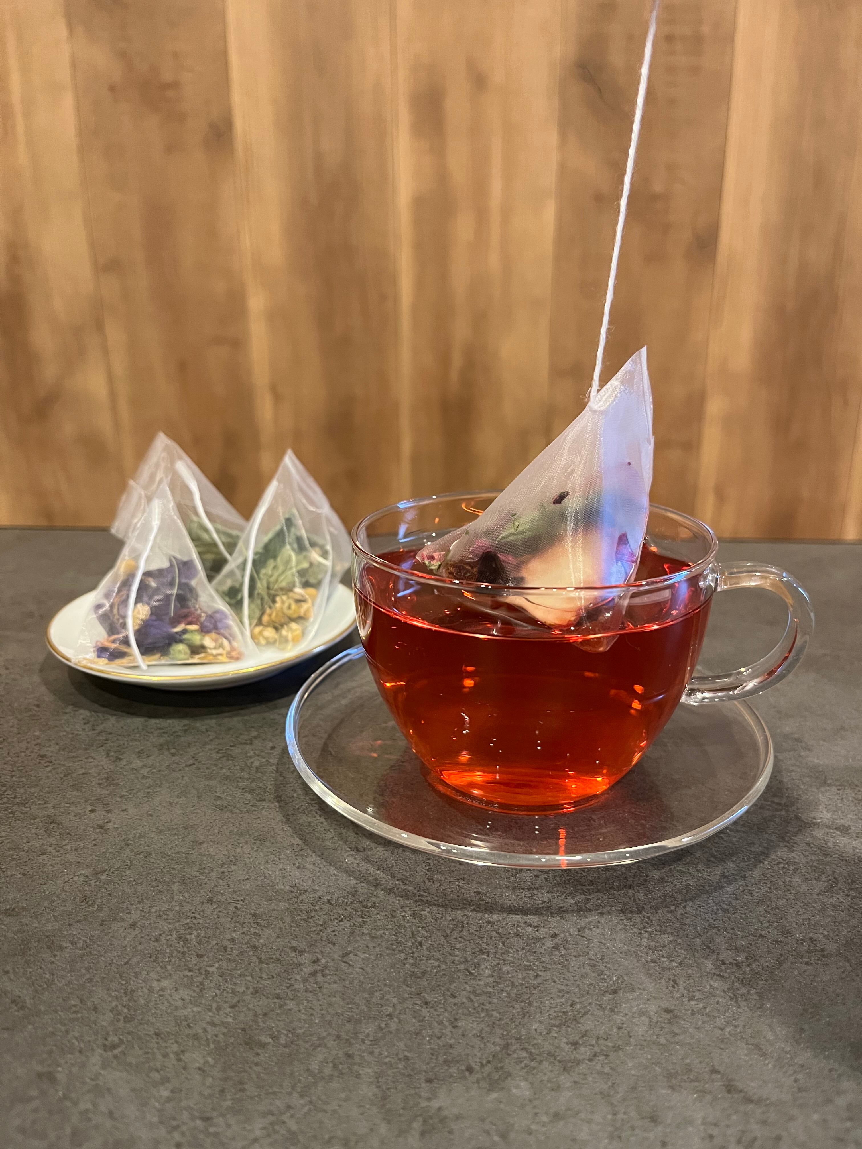 ハーブティーの種類によってティーバッグをメッシュ素材と不織布素材を使い分けています。タグ付きタイプなのでポットだけでなくマグカップにそのまま入れていただけます。